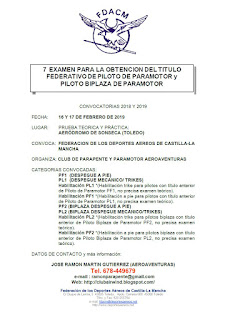 Convocado el próximo examen para pilotos de paramotor y pilotos biplaza de paramotor. La FDACM celebrará el próximo fin de semana 16 y 17 de febrero el 7º Examen para pilotos de paramotor. Se convocan todas las categorias tanto de monoplaza como bilplaza (PF1, PL1, PF2 y PL2).