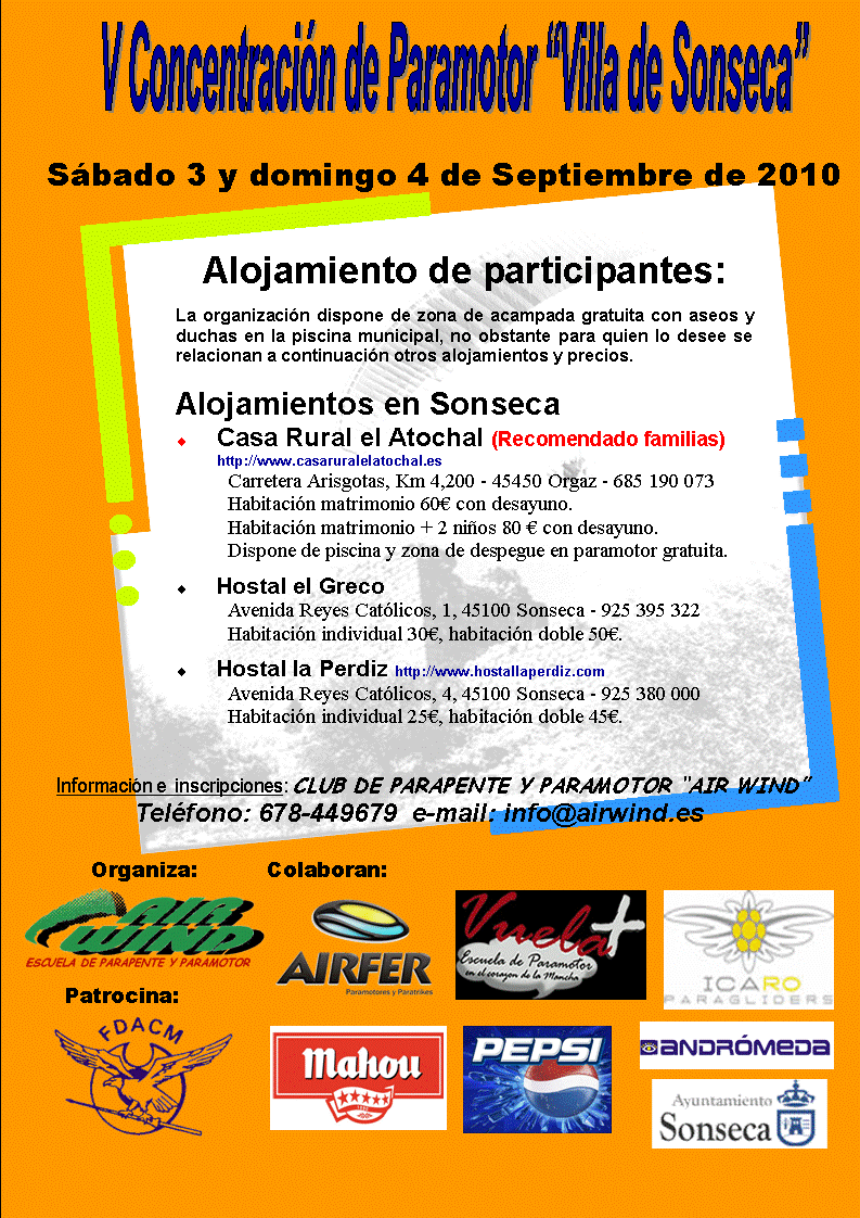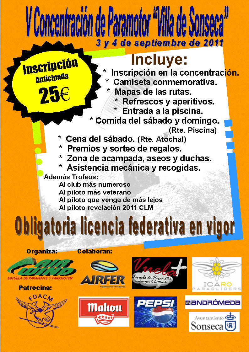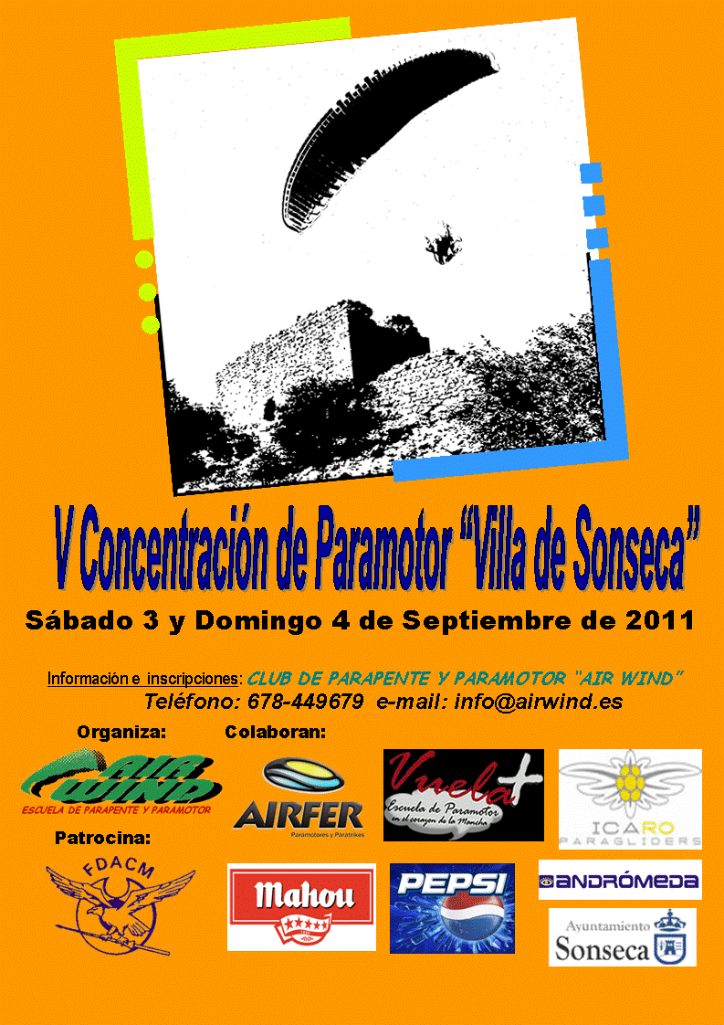Hola amigos y compañeros, os anuncio que ya hay fecha para la V Concentración de Paramotor "Villa de Sonseca" de este año 2011, las fechas serán el 3 y 4 de septiembre y en breve publicaremos el programa de actividades y los datos para la preinscripción, así como información complementaria, pero ya os adelanto que habrá distintas rutas, biplazas, zona de acampada y distintos alojamientos, piscina, camiseta conmemorativa, aperitivos en la zona de vuelo, comida del sábado y del domingo (en la Piscina), cena de hermandad el sábado (Rte. el Atochal), premios y sorteo de regalos... y sobre todo muy buena voluntad para que todos lo paséis bien y voléis mucho.