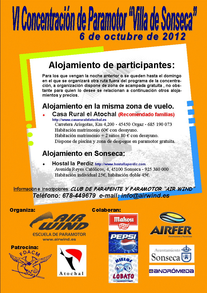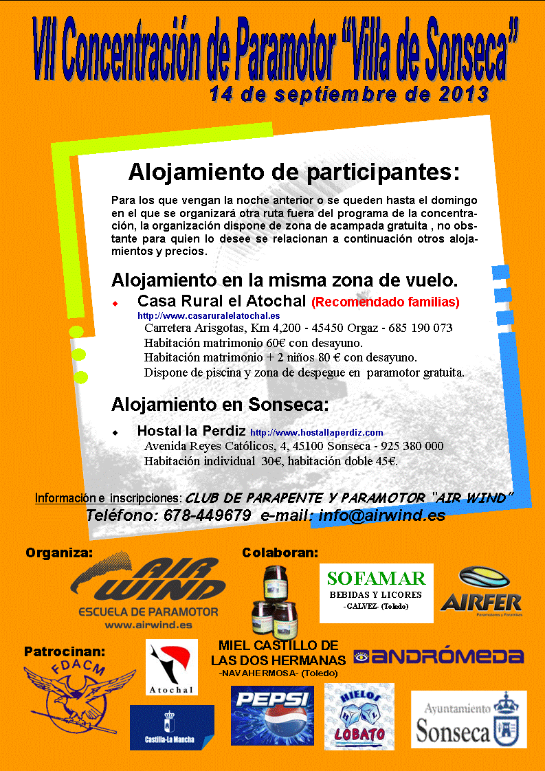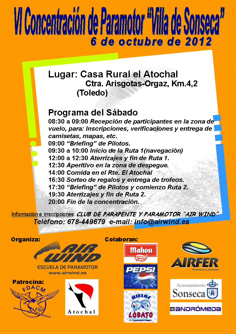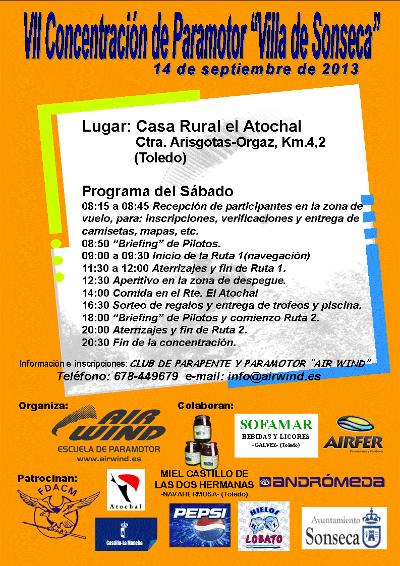 Hola amigos y compañeros, os anuncio que ya hay fecha para la V Concentración de Paramotor "Villa de Sonseca" de este año 2011, las fechas serán el 3 y 4 de septiembre y en breve publicaremos el programa de actividades y los datos para la preinscripción, así como información complementaria, pero ya os adelanto que habrá distintas rutas, biplazas, zona de acampada y distintos alojamientos, piscina, camiseta conmemorativa, aperitivos en la zona de vuelo, comida del sábado y del domingo (en la Piscina), cena de hermandad el sábado (Rte. el Atochal), premios y sorteo de regalos... y sobre todo muy buena voluntad para que todos lo paséis bien y voléis mucho.