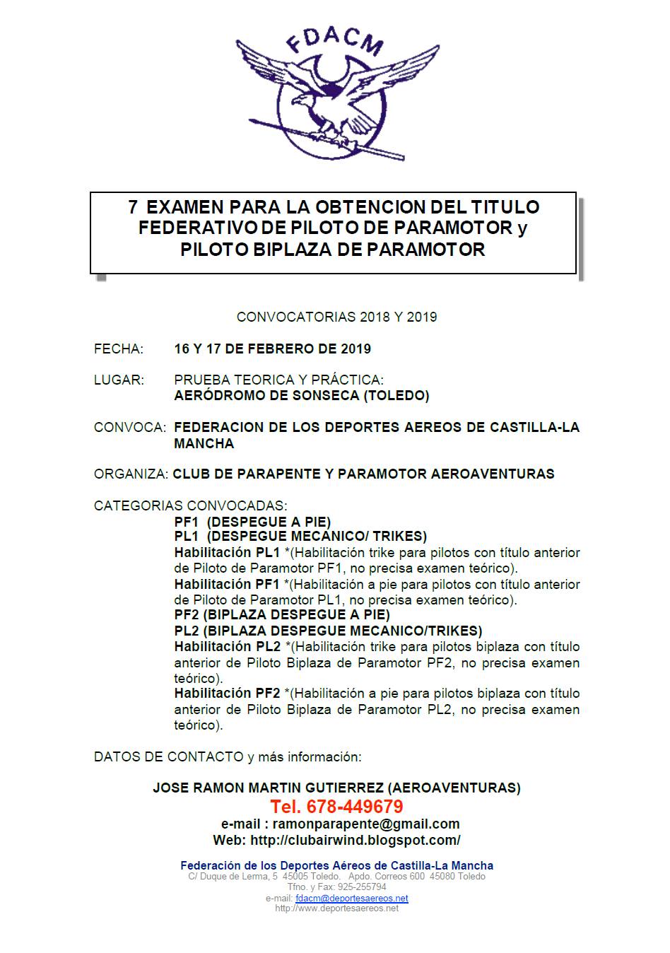 Convocado el próximo examen para pilotos de paramotor y pilotos biplaza de paramotor. La FDACM celebrará el próximo fin de semana 16 y 17 de febrero el 7º Examen para pilotos de paramotor. Se convocan todas las categorias tanto de monoplaza como bilplaza (PF1, PL1, PF2 y PL2).